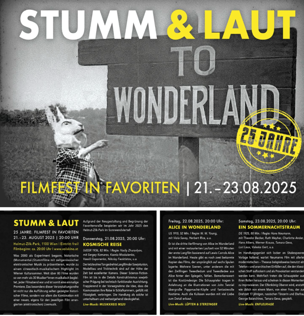 Das Filmfest Stumm & Laut zeigt Stummfilme mit elektronischer Live-Musik Begleitung. An drei Abenden werden Stummfilmklassiker und Neuentdeckungen unter freiem Himmel und bei freiem Eintritt gezeigt, die von den jeweiligen Musikerinnen und Musikern live vertont werden.